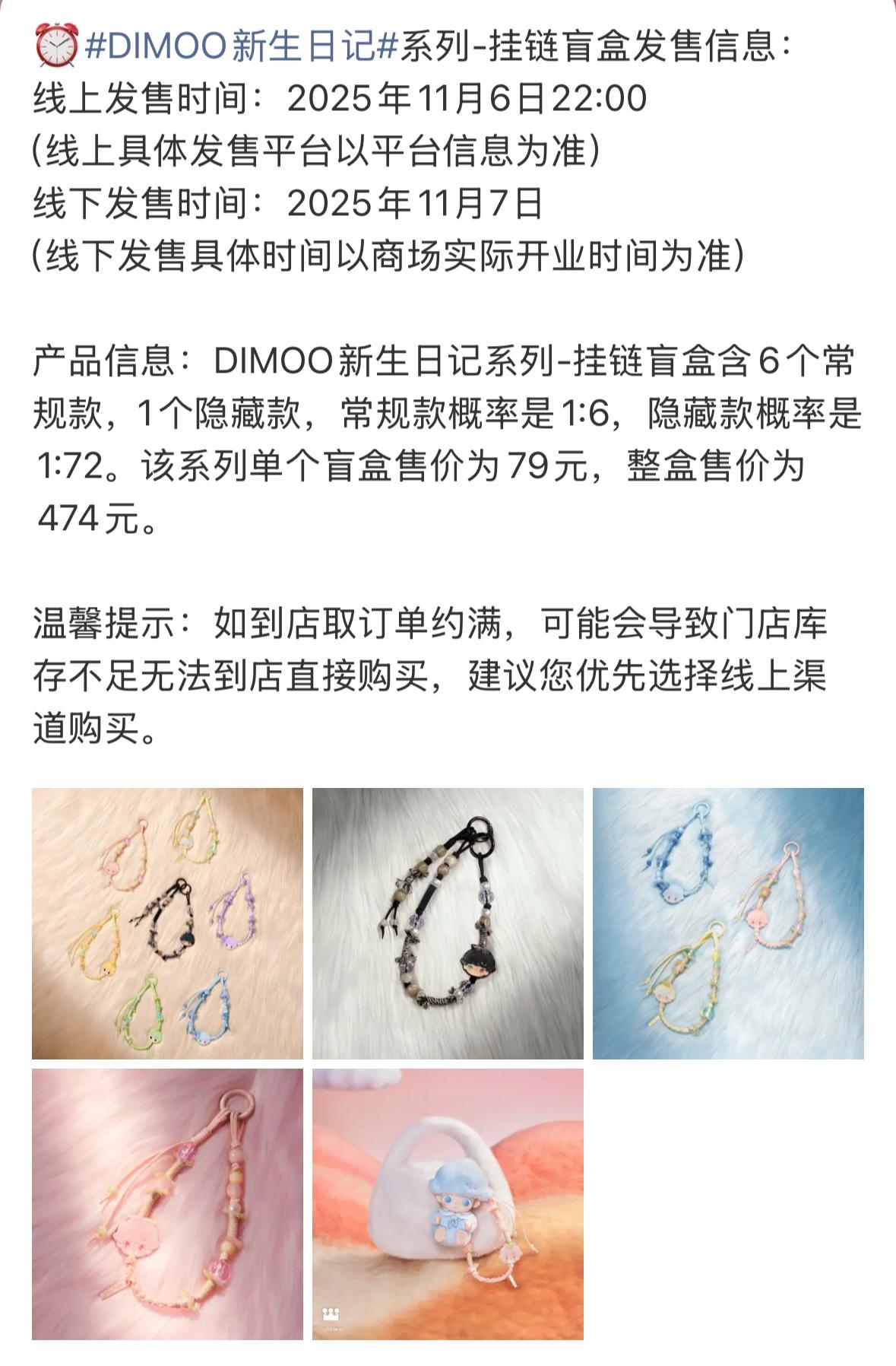 经查询,涉事产品系泡泡玛特11月新推出的“DIMOO新生日记系列-挂链盲盒”。据泡泡玛特介绍,该盲盒系列含6个常规款,1个隐藏款,常规款概率是1:6,隐藏款概率是1:72。该系列单个盲盒售价为79元,整盒售价为474元。